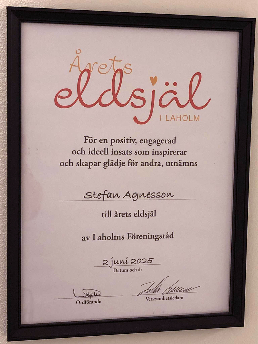 Det var fullt ösregn på Nationaldagen 2025 när Stefan Agnesson, ledare för Laholms Ungdomsbrandkår, blev hyllad på scen i Stadsparken som en av årets eldsjälar i Laholm. En tapper skara kom i regnställ och med paraplyer för att se och applådera prisutdelningar, tal, folkdans, sång och musik. Det är de hängivna som dyker upp och trotsar väder och vind.