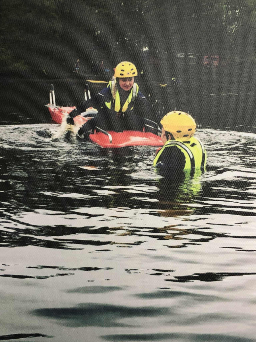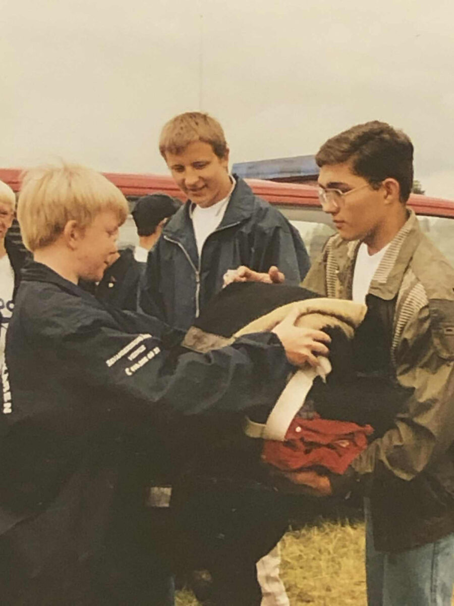 – Jag måste ju också få berätta att min egen son Benny som fyller 40 i år tjatade om att vara med i Ungdomsbrandkåren redan när han var i tolvårsåldern. De har ju öppet hus ibland på Brandstationen, och han blev ”eld och lågor” över att få åka hävare. Han tittade mycket på räddningsprogram som ”112 på liv och död”. Då ringde jag till Stefan och så småningom fick Benny komma med. Han syns på många gamla foton, och han har bland annat varit med på läger i Finland tillsammans med sina kompisar från Laholm. Några av dem, Micke och Rickey, är nu deltidsbrandmän i Laholm. Ungdomsbrandkåren bidrar till att öka intresset för att arbeta med blåljus. Numera kör Benny själv ambulans och är mycket engagerad i sitt dagliga arbete med alla sjukvårdsrutiner för att rädda folk som är nödställda.