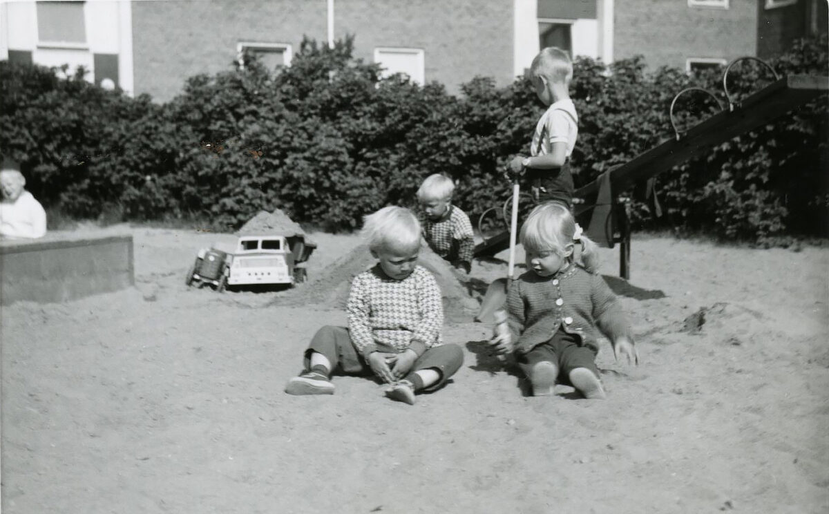 Asfalt är något som många tycker är både fult och tråkigt. Själv gillade jag asfalten när jag var liten! Den var lätt att cykla på, man kunde rita hagar och andra figurer med tavelkrita och det var ett perfekt underlag att hoppa rep på. Det doftade gott när det regnade och ljumma sommardagar var det skönt att gå barfota på den släta ytan. Ett och annat skrubbat knä var väl nackdelen, men med plåster på var det snart glömt. Dessutom lyser de gula maskrosor som lyckas slå rot i någon spricka, så fint mot det gråsvarta. Det fanns också gott om gröna gräsmattor att leka på och runt den stora lekplatsen mellan Glänningehus och Breidablick växte stora nyponbuskar med hemska taggar och nypon fulla av klipulver. Man kan fundera över hur man tänkte när man planterade dem runt en plats som barn skulle leka på. Fast vi stannade ju på lekplatsen, ingen hoppade genom de buskarna! På tal om hoppa, utanför vår balkong på första våningen hade vi en sandlåda. Dit kunde vi hoppa direkt från balkongkanten som fanns nederst på utsidan av det murade balkongräcket. Bara att klättra över räcket, ställa sig på kanten och så ett rejält skutt över nyponbuskarna som även fanns där, och så var man vid sandlådans kant. Ett av många små bus man egentligen inte fick göra…