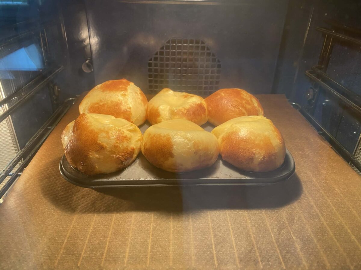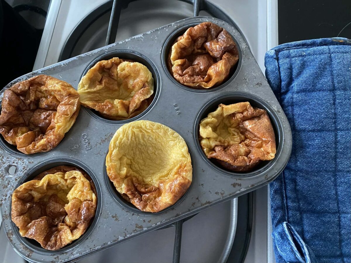 Blanda allt det torra i en bunke. Häll i hälften av mjölken och rör till en klumpfri smet. Häll i resten av mjölken och äggen. Rör runt och låt stå en stund. Smörj formarna med smält smör. Fyll formarna till 2/3 med smeten och ställ in i mitten av ugnen i ca 12-15 minuter. Grädda till de blir gyllenbruna och har blåst upp sig som ägg. De sjunker ihop när man tar ut dem.
