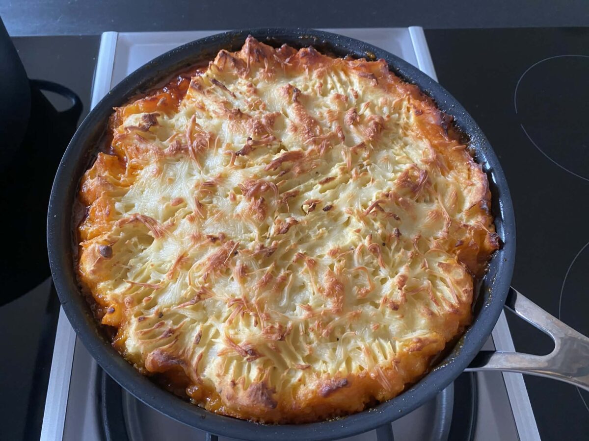 Om man har en ugnssäker stekpanna funkar det fint att lägga moset uppepå färsen och strö över osten. Annars kan man ta en ugnssäker form och lägga färsen först, moset sedan och osten överst.
