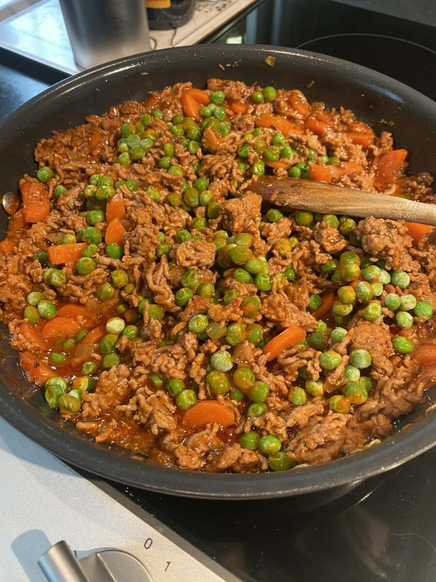 Stek morötter, lök, vitlök i smör en stund. Lägg sedan i färsen och stek till färsen är genomstekt. Tillsätt tomatpuré och stek ytterligare en stund Pudra över mjölet och rör runt, blanda i vatten, oxfond, worcestersås, timjan och rosmarin. Låt sjuda i 20 minuter. Vänd i ärter.